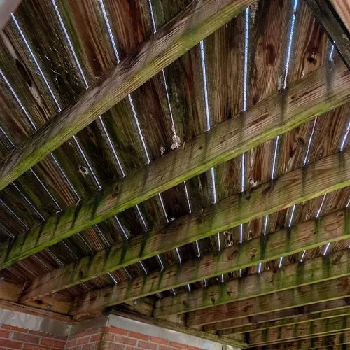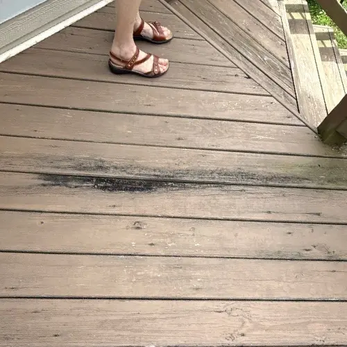 The decking surface was covered in active dark mold and mildew streaks, the result of long-term water damage.